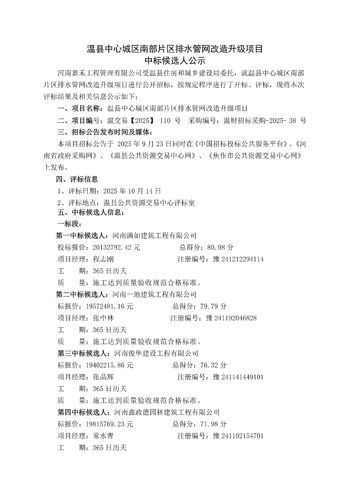 温县中(zhong)心城(cheng)區(qu)南(nan)部(bu)片區(qu)排(pai)水筦(guan)网改造(zao)升级項(xiang)目(mu)中(zhong)标候选人(ren)公(gōng)示