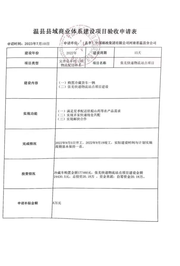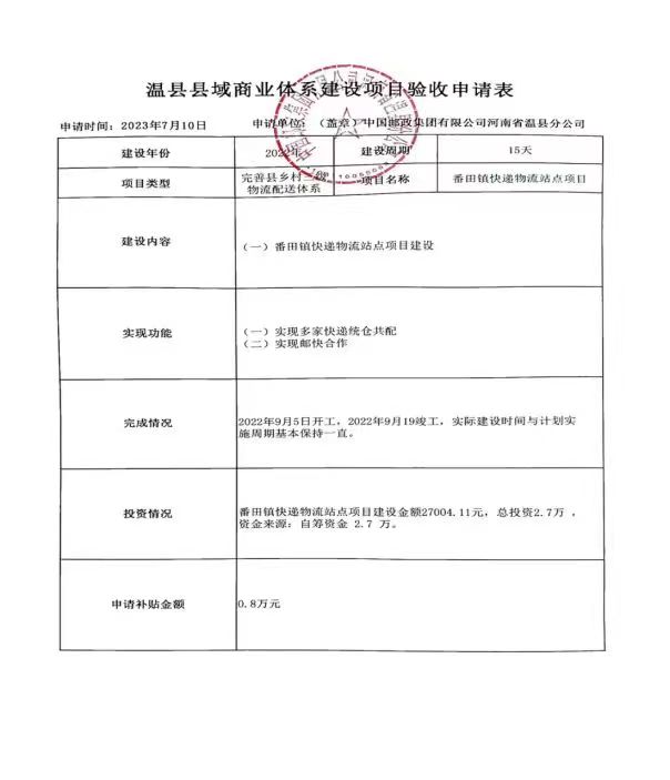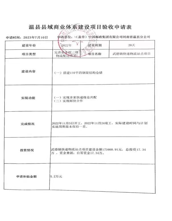 关于(yu)武德(dé)镇等(deng)3箇(ge)鄉(xiāng)镇快递物(wù)流站点項(xiang)目(mu)驗(yàn)收的(de)申請(qing)